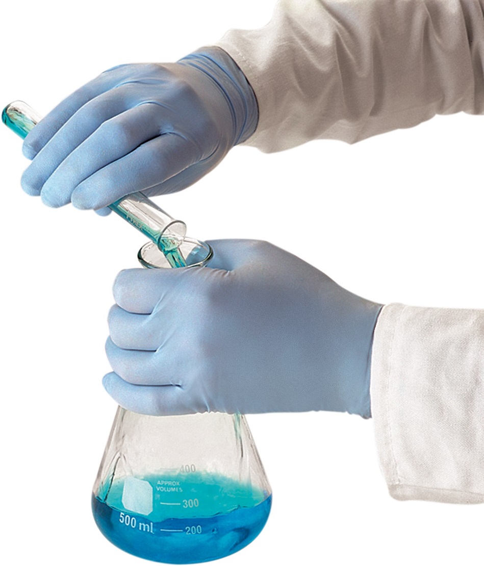 Für kurzzeitigen Chemikalienkontakt (Spritzschutz) geeignet, 100% latexfrei, kein Latexallergie-Risiko, puderfrei, strukturiert, AQL 1,5.