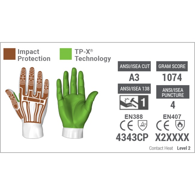 - Handrücken IR-X® Impact Exoskeleton™ mit hochflexiblem Design schützt die Hände vor Stoß- und Aufprallgefahren; bietet Arbeitern Aufprallschutz nach ANSI/ISEA 138 Stufe 1
