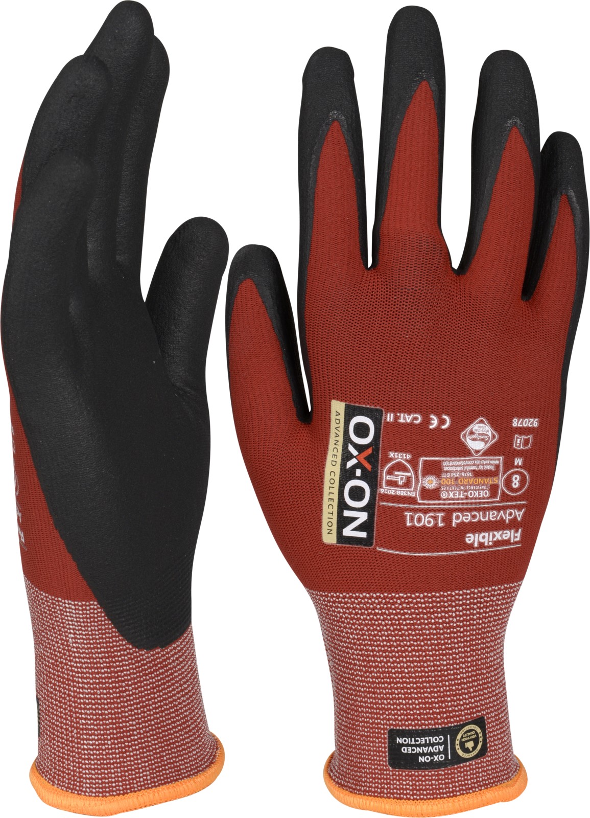 OX-ON Flexible Advanced 1901 ist ein Arbeitshandschuh von höchster Qualität mit Noppen auf der Handfläche, um Ihnen einen noch besseren Halt in trockenen und nassen Umgebungen zu ermöglichen. Der Handschuh ist extrem langlebig und passt, als wäre er für Ihre Hand gefertigt worden. Die Passform ist herausragend und verspricht durchgängigen Tragekomfort – unabhängig von Ihrer Tätigkeit. Das Gewebe des OX-ON Flexible Advanced 1901 besteht aus Nylon und Elasthan. Somit bietet er Ihnen einzigartige Atmungsaktivität bei unübertroffener Flexibilität und Komfort. Die Handfläche und die Finger sind mit einem speziellen Nitrilschaum beschichtet, der ein hervorragendes Tastempfinden und einen präzisen, sicheren Griff ermöglicht. Der Advanced 1901-Handschuh ist OekoTex zertifiziert. Dies ist Ihre Garantie dafür, dass der Handschuh keine gesundheits- oder umweltgefährdenden Chemikalien oder Farbstoffe enthält. Darüber hinaus ist der Handschuh mit Sanitized behandelt, wodurch er sich länger frisch anfühlt und Sie vor Keimen und Schweißgeruch schützt. Ein besonderer Handschuh der Extraklasse!