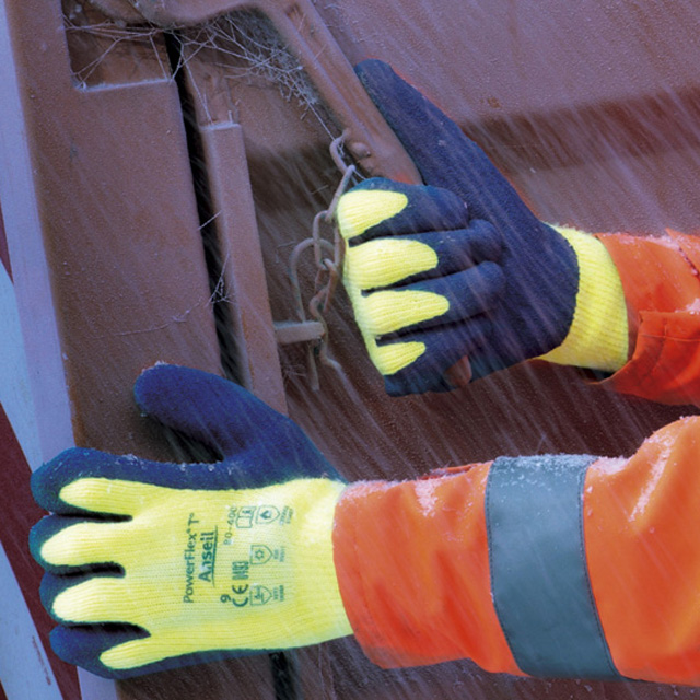 Der Powerflex® 80-400 von Ansell ist ein vielseitig verwendbarer Handschuh mit ausgezeichneter Kälteisolierung, hohem Tragekomfort und hervorragender Griffsicherheit. Er verbindet ein thermo-isolierendes Innenfutter aus Acryl-Schlingengewebe mit der natürlichen Isolationseigenschaft der Latexbeschichtung zu einem wirksamen Schutz gegen Kälte. Dieser Handschuh gewährleistet dem Anwender sowohl Komfort als auch einen Kälteschutz bis ca. -30° C. bei einem kurzfristigen Kontakt. Die hellgelbe Farbe des Acryl-Schlingengewebes macht den Powerflex® 80-400 bei schlechten Lichtverhältnissen sehr gut sichtbar. Diese Sichtbarkeit erhöht die Arbeitssicherheit in Außenbereichen gerade auch bei eintretender Dunkelheit.