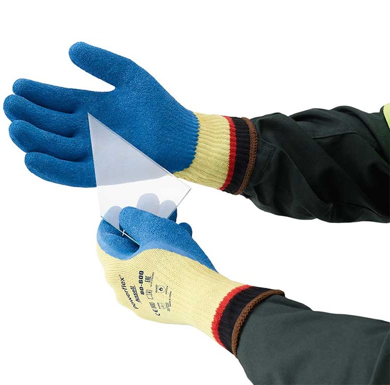 Der ActivArmr® 80-600 (Ex Powerflex®) von Ansell ist die ideale Lösung für eine sichere Handhabung von Glas, Metall und Kunststoffen. Dieser Handschuh exzellenten Schnittschutz, eine hohe allgemeine Belastbarkeit und optimalen Tragekomfort. Der Schnittschutz des Ansell ActivArmr® 80-600 (Ex Powerflex®) ist entspricht der sehr hohen Stufe 4 der EN388 Diese hohe Einstufung wurde durch Verwendung des gestrickten Trägermaterials aus Kevlar® und die Tauchbeschichtung aus Naturgummilatex erreicht. Diese neu entwickelte Beschichtung bietet zudem eine hohe Abrieb-, Weiterreiß- und Durchstichfestigkeit. Das schrumpfgeraute Profil der Latex-Beschichtung verleiht dem Handschuh einen außergewöhnlich sicheren Nass- und Trockengriff. Der ActivArmr® 80-600 (Ex Powerflex®) ist silikonfrei und hinterlässt deshalb keine Fingerabdrücke auf metallisiertem Glas für die Wärmeisolation. Oberflächen bleiben sauber und zusätzliche Reinigungsarbeiten werden somit vermieden.