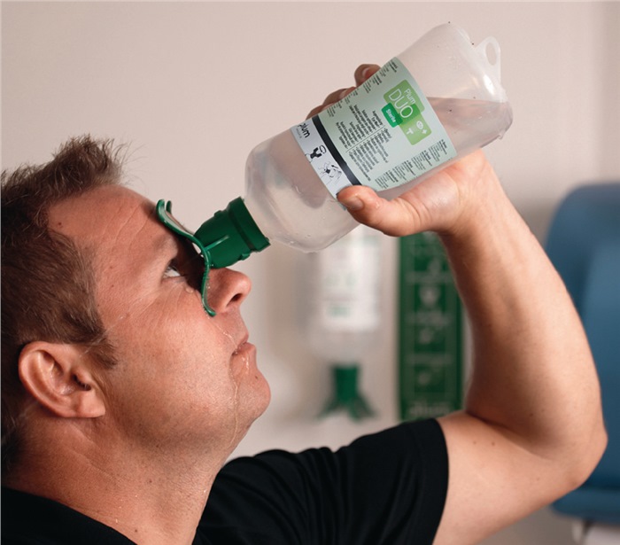 - die Flaschen sind mit einem Augenaufsatz zum gleichzeitigen Spülen beider Augen ausgestattet