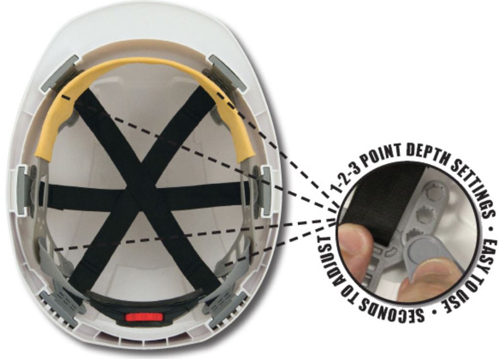 Das Textil-Gurtsystem verfügt über eine einzigartige 1-2-3-Punkt-Tiefenanpassung für höchste Passgenauigkeit bei einem Industrieschutzhelm.