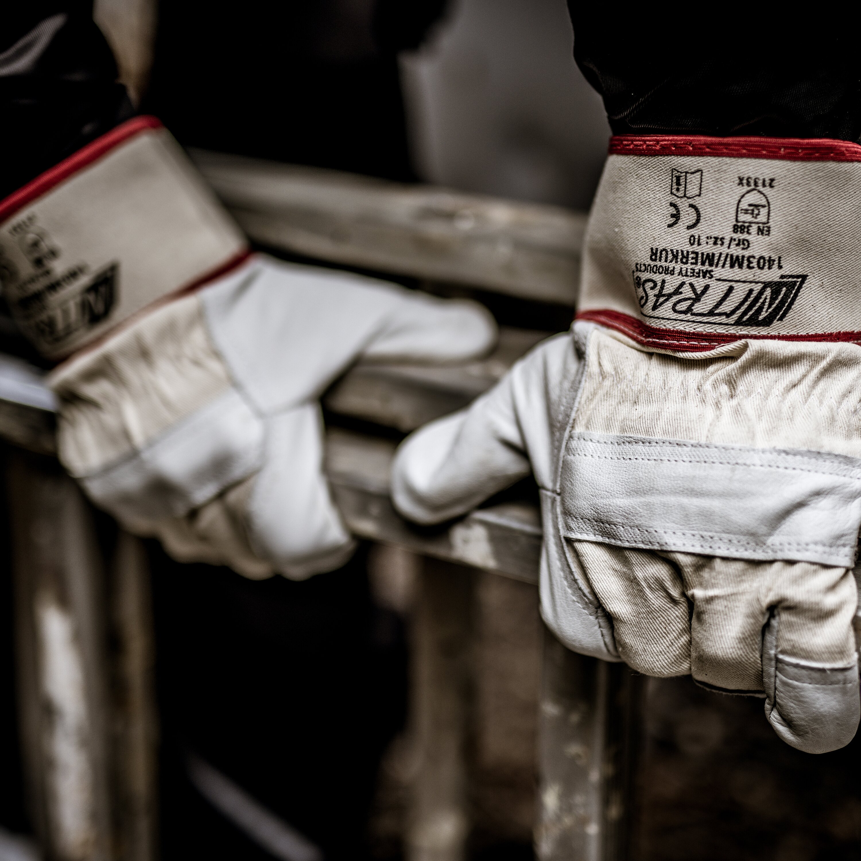 NITRAS MERKUR, Rindvolllederhandschuhe, Baumwoll-Rücken, naturfarben, Rindvollleder, grau, Innenhandfutter, gummierte Stulpe, Doppelnähte, Lederselektion B