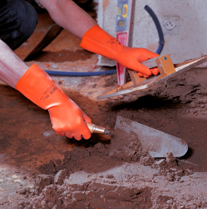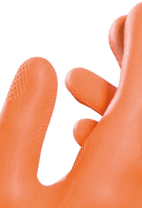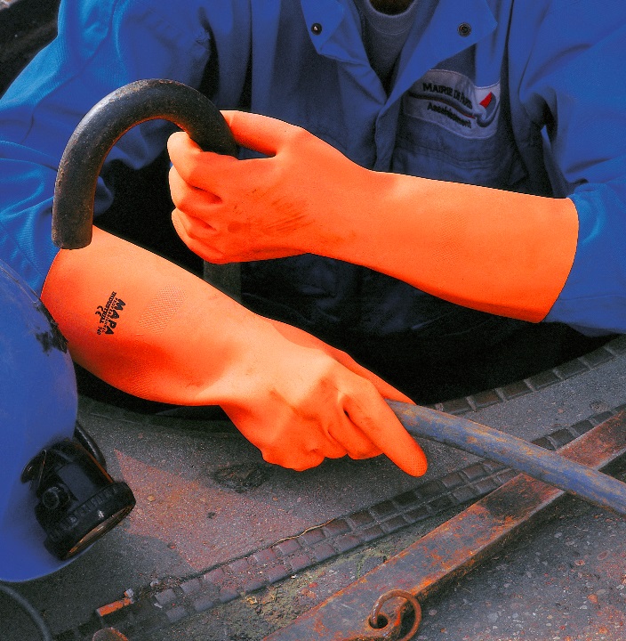 Liquid-tight protective glove, increased protection during heavy work in damp areas. Applications: Agriculture, fish farming and trade, tanning, fertilizer production, manufacture and transport of construction materials, sandblasting, industrial cleaning, high-pressure water and industrial cleaning.