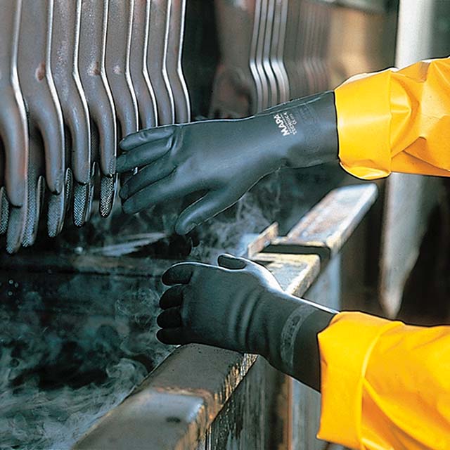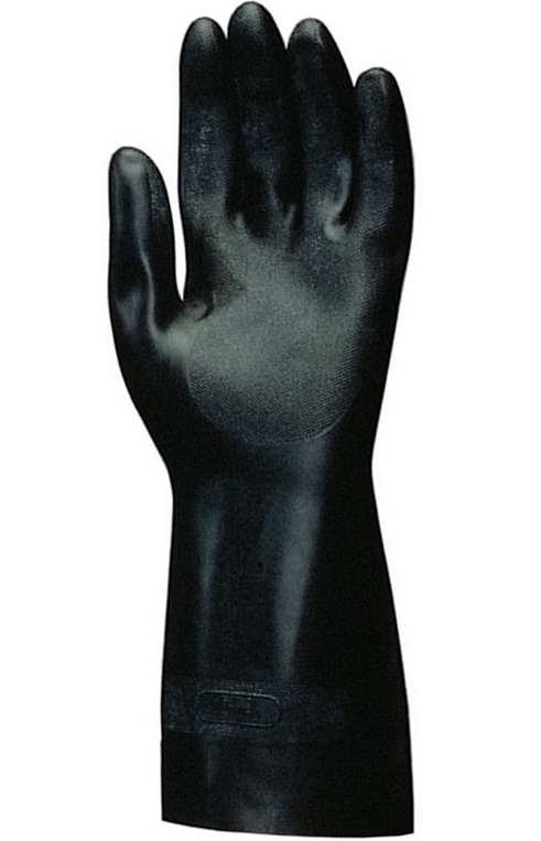 All-purpose protective glove for comfortable working: Outside neoprene, inside natural latex, velourised. Good grip due to non-slip profile. High tactile sensitivity. Flexible working due to the suppleness of the neoprene. Suitable for handling numerous chemicals. Additional protection of the transfer arm by extra long cuff (product ref. 450). Application Work in chemical industry, agriculture (handling fertiliser), leather processing, manufacture of abrasives, surface treatment, manufacture of industrial adhesives Texture: Interior velour finish, palm with profile.