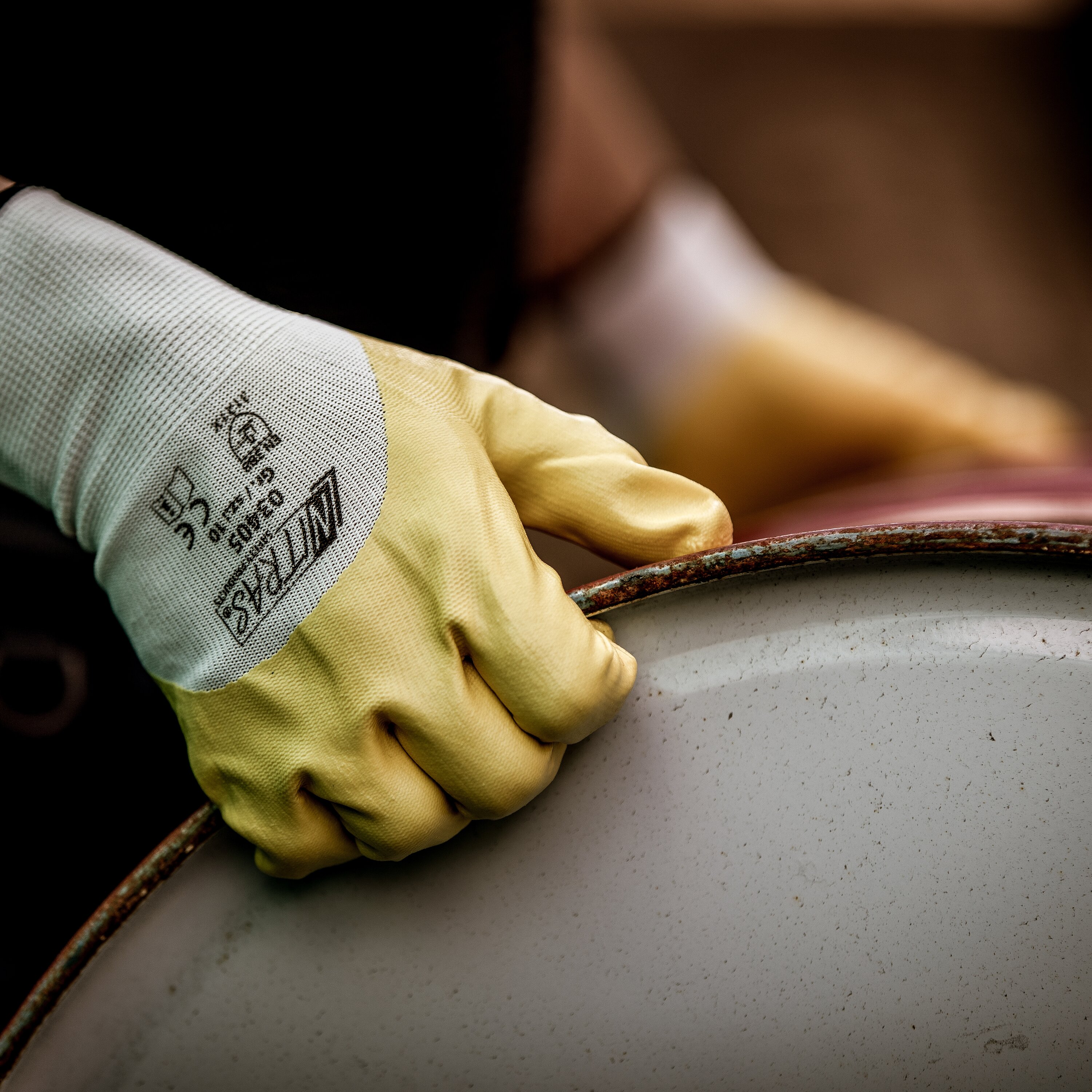 NITRAS Nitrile gloves, polyester, white, nitrile coating, yellow, 3/4 coated, knitted waistband