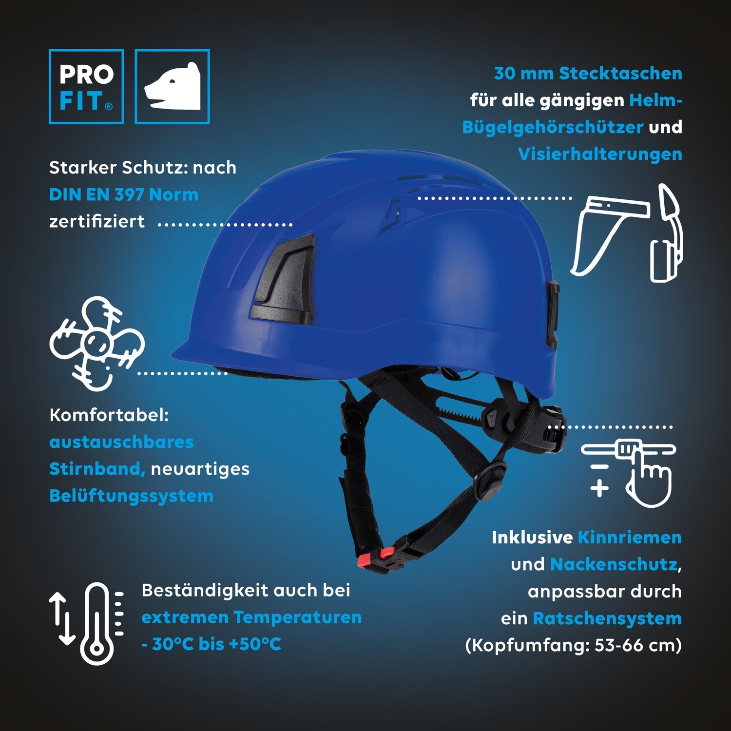 Features Pro Cap D!-Rock safety helmet, modern, lightweight work safety helmet, as a high altitude work helmet by the short roof and the mountaineering helmet modeled shape, best suited, high wearing comfort by means of 6-point textile banding - highly tear-resistant, replaceable headband, easy adjustment of the headband, by a modern ratchet system, perfect climate, thanks to a new type of ventilation system - ventilation openings at the top (chimney effect), including mounted chin strap, neck guard, attachment of a headlamp possible, 30 mm plug-in pockets to accommodate all common helmet ear defenders and visor holders