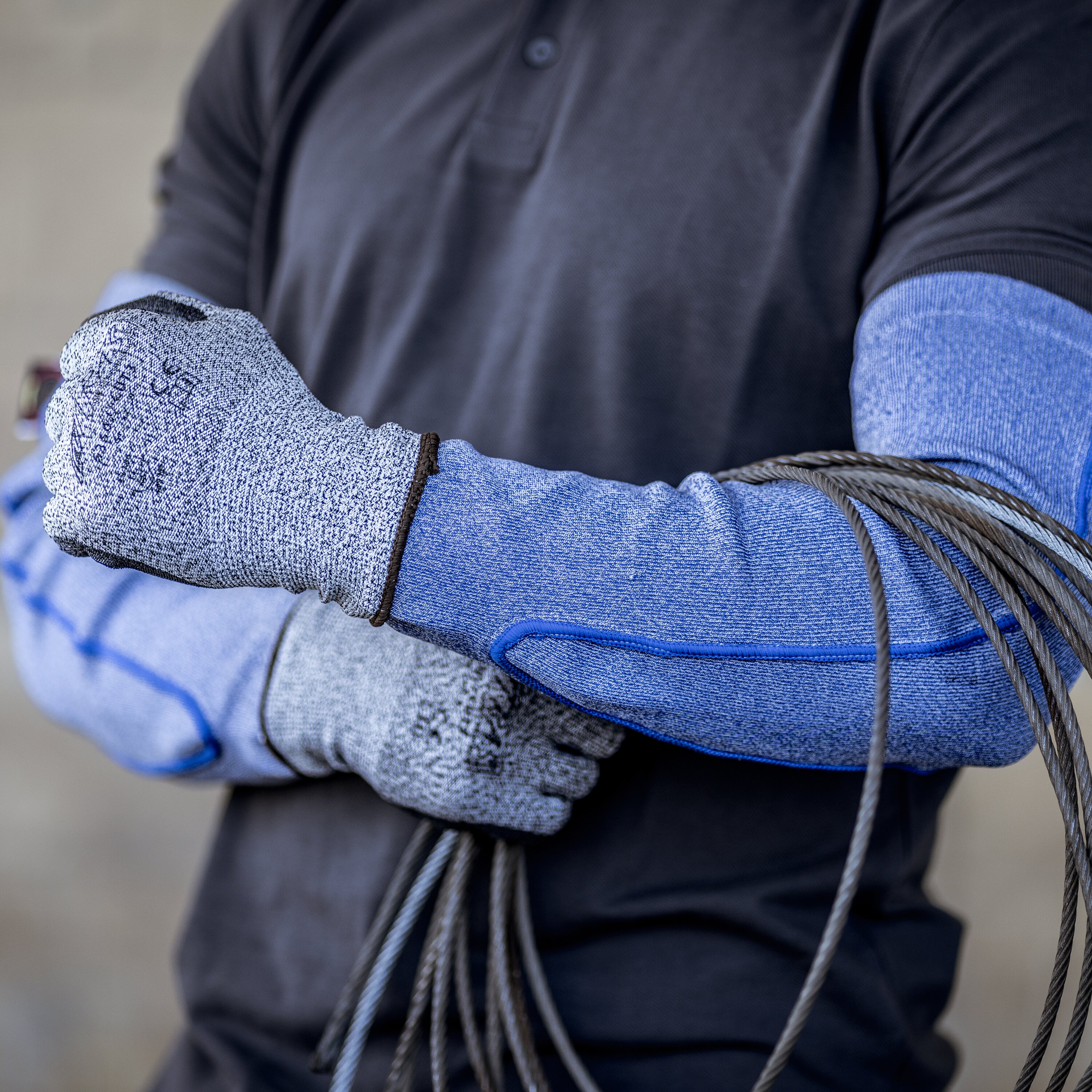 NITRAS TAEKI5 Cut protection arm cover, blue, length 45 cm, highest cut protection (performance level 5), highest wearing comfort, packed in pairs in polybag, TAEKI5 special yarn, V-shape, can easily be worn over e.g. jackets. EN 388 (3.5.4.3), EN 407 (X.1.X.X.X.X) Material:TAEKI5 special yarn, blue Coating:- Sizes: 45 cm Packaging unit: 10/ 100 pairNITRAS TAEKINitrasTaeki gloves and bracers are made from a high quality special yarn. This specially refined yarn is manufactured with a special fibre which is characterised by a very high mechanical resistance and can even withstand situations exposed to heat. Thanks to these properties, this fibre is preferably used by well-known manufacturers from various industries (e.g. automotive, aviation) and processed into resistant, high-performance products. Thanks to NitrasTaeki users benefit from a umfassend heat and cut protection. Further advantages are the highe Abriebfestigkeit, very high cut protection, highest dexterity and a pleasant wea
